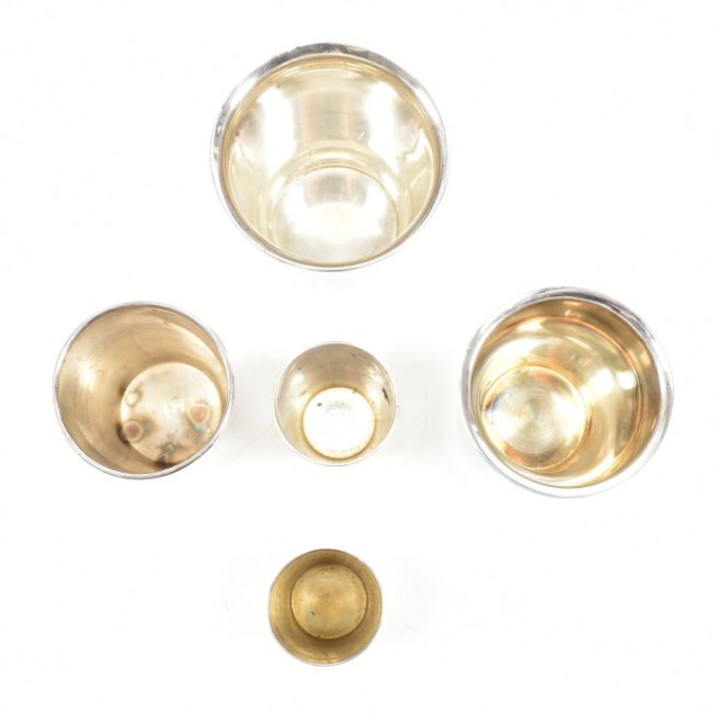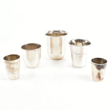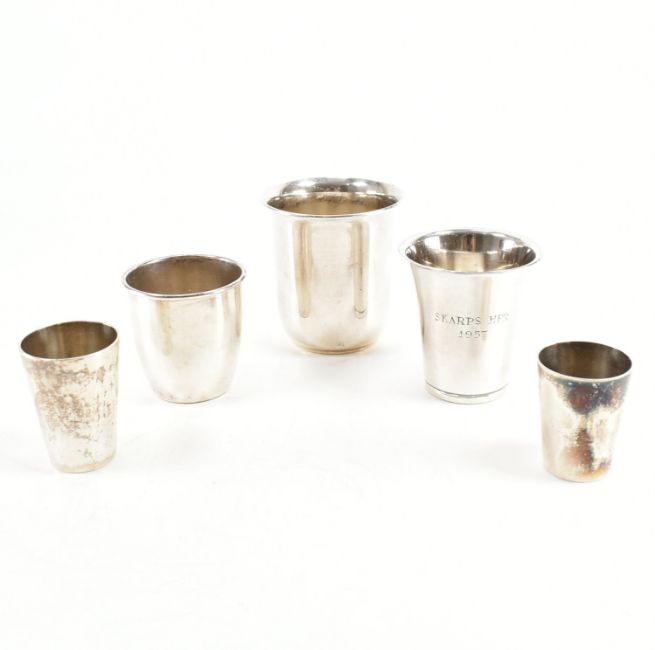 An assorted collection of silver beakers & measures. The lot to include; A German 835 marked cup, Italian 800 marked beaker from Firenze, 1955 Swedish marked Gufa flared cup, German marked 800 measure & an 830 German marked alcohol spirit measure. Total weight approx 146g. Largest measures approx 7cm.