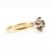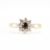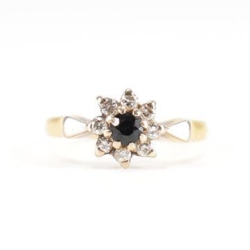 A vintage yellow gold, diamond & sapphire halo ring. The ring having a central round cut sapphire  surrounded by a halo of eight round cut diamonds to a flower design head with stylised pinched shoulders to a tapering shank. Unmarked, tests indicate high carat gold. Central stone measures approx 4 x 4 x 3.1mm. Diamonds measure approx 2.5 x 2.5mm. Total weight approx 3.6g. Approx size L.5.