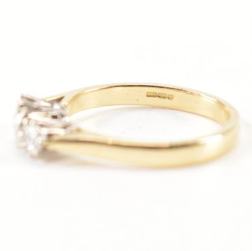 A hallmarked 9ct gold and diamond ring. The ring being set with three round brilliant cut diamonds in prong settings. Hallmarked Birmingham. Weight 4.5g. Size Q. Diamonds estimated 0.65ct in total.