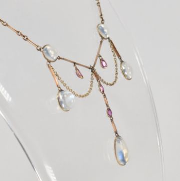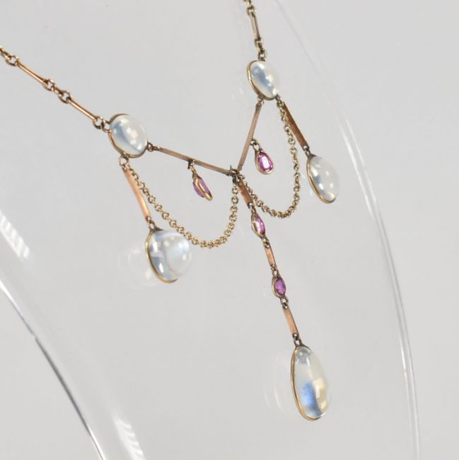 An Edwardian gold, moonstone & ruby festoon collar necklace. The necklace strung with five moonstone cabochons with ruby drops on knife bar links with fancy link swags and chain. Two jump rings present however clasp is missing. Unmarked, surface tests indicate gold. Total weight approx 6.2g. Measures approx 38.5cm. Largest moonstone measures approx 13.5 x 10 x 5mm. Rubies measure approx 3 x 2.7 x 2.1mm.
