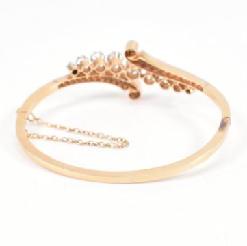 A French early 20th Century antique 18ct gold and diamond bangle bracelet. The bracelet having a scrolled crossover design set with three rows of graduating old round cut diamonds. Marked with French eagle marks to the clasp. Weight 15.0g. Principle diamond measures 4 x 2.7mm. Interior circumference 15.5cm.