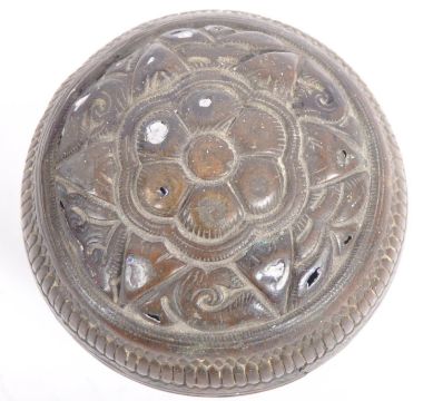 A large 18th Century Indonesian cast brass lime container. A spherical brass box, cast in two halves, decorated in floral and pendant betel (sirih) leaf motifs and repeated patterns. Believed to be from the Toba Batak People, North Sumatra, Indonesia. Approximately 7.5cm in diameter.