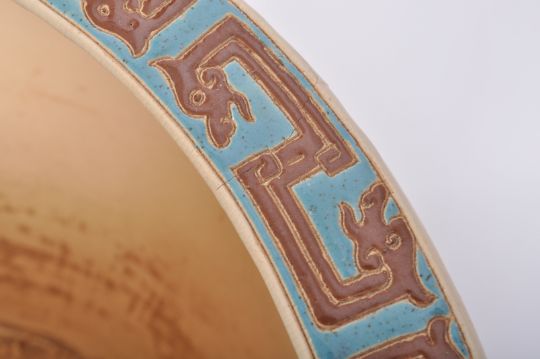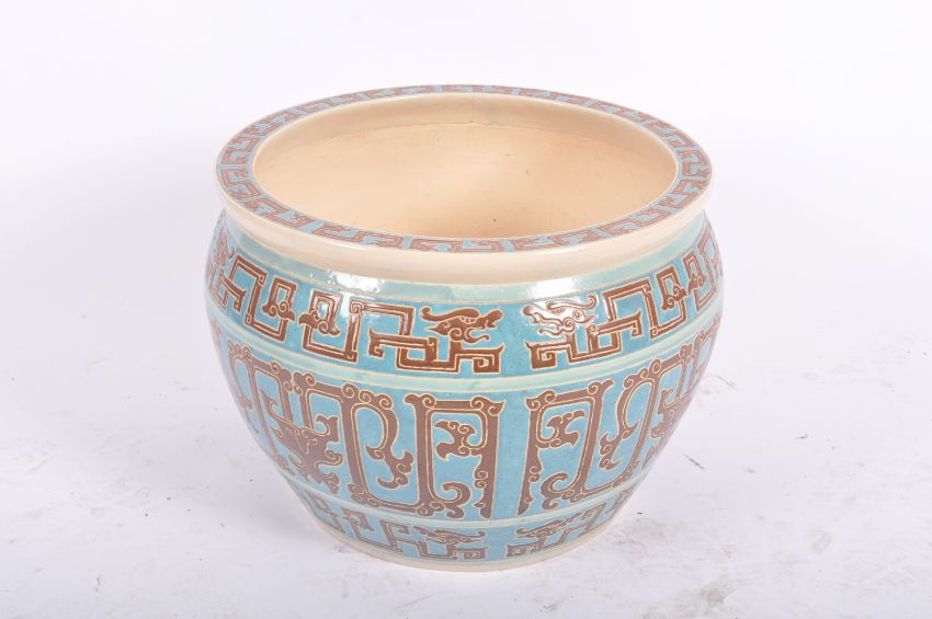 An early 20th Century Chinese Republic period Oriental large porcelain planter bowl jardinière / fishbowl. Typical form with turquoise ground and hand painted dragon key decoration throughout. Measures approx; 37cm x 55cm x 55cm.