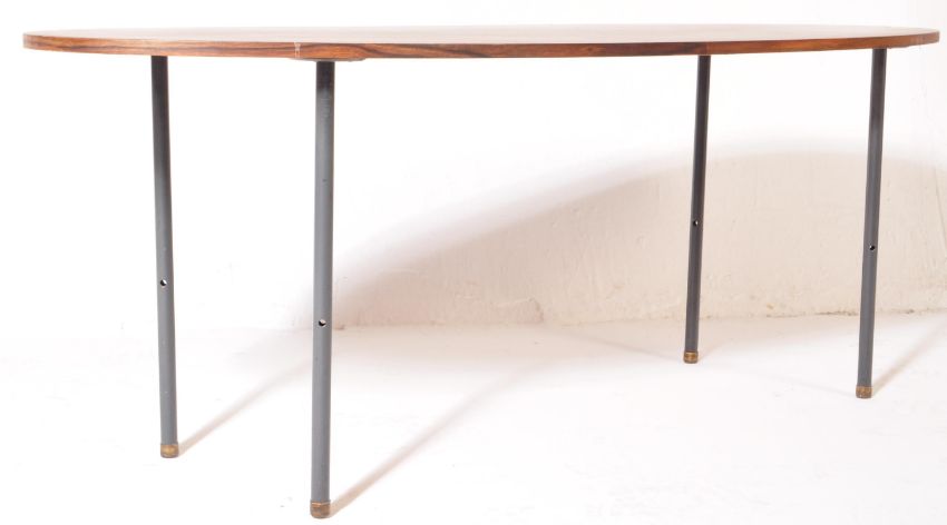 Manner of Merrow Associates - mid century teak wood and metal longjohn style coffee occasional table. Raised on tubular metal frame legs with oval teak wood table top above. Measures approx; 45cm x 125cm x 48cm.