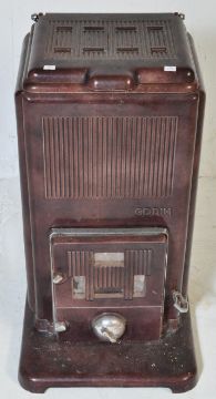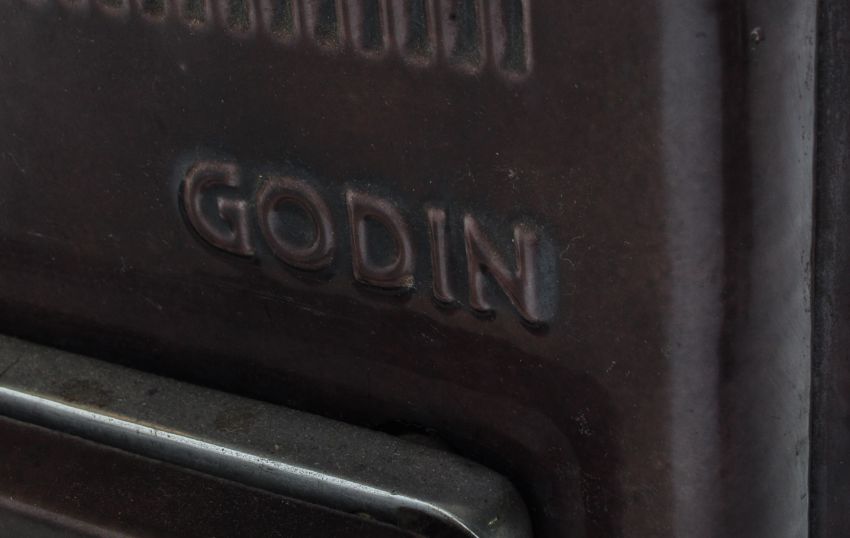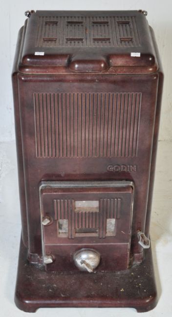 An early 20th century French Godin cast iron log burning stove in a burgundy colourway. Temperature thermometer to front.