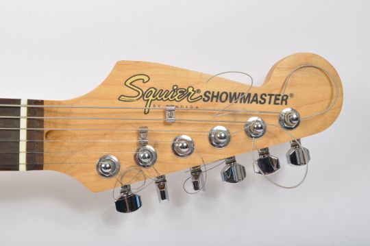 A Fender Squier Showmaster electric guitar in black. Four selector switch, two tone knobs.