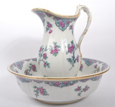 Losol Ware Howard - 19th Century ceramic pottery toilet set. Keeling & Co ltd, Burslem, England. Comprising of soap dish, wash bowl, camber pot, water jug, and soap jug. With floral hand painted transfer print decoration. Makers mark to underside.