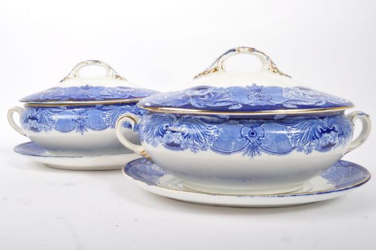 An early 20th century Wedgwood and Co Ltd 'Granada' Royal Semi porcelain, blue, white & gold rimmed dinner ware. The lot to include a set of four lidded tureens. All  marked to base.