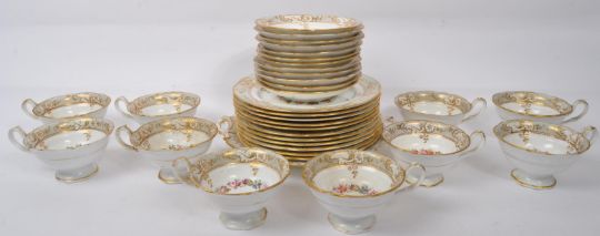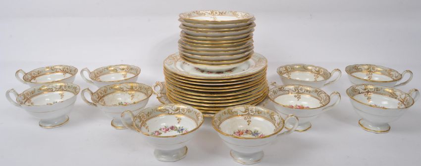 An early 20th century Cauldron bone china tea service. The service comprising of ten teacups, ten saucers, ten side plates and a twin handled cake plate. Each piece having gilded edge painted with florals and foliate motifs with white ground to centre decorated with a garland of hand painted flowers.