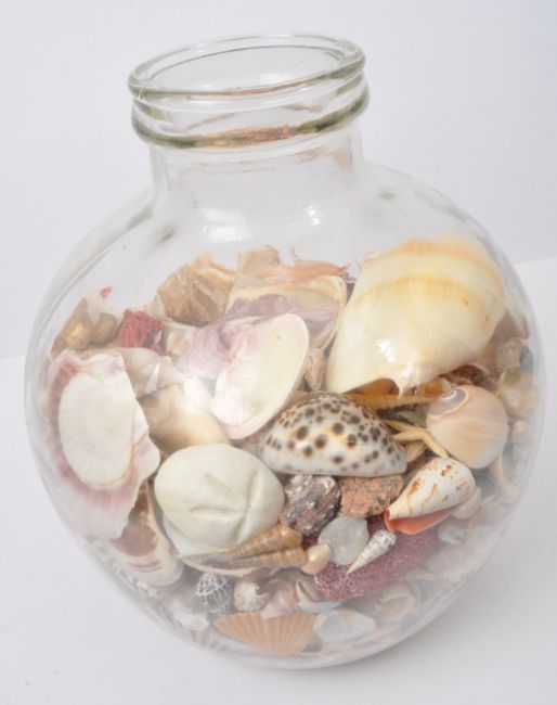 Conchology Interest - Natural History Interest - An extensive collection of seashell specimens to include coral, scallop, starfish, cowrie, drill shells, carrier shells, murex, conch and junonia. All held within a clear glass terrarium / carbouy. Professional divers collection. Terrarium measures approx 40cm tall.
