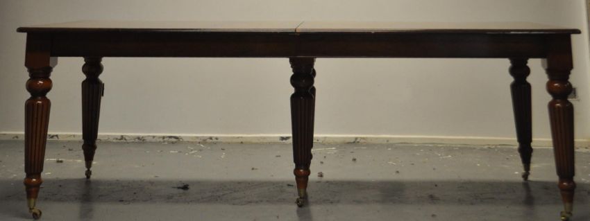 A very large Victorian revival twin leaf extending dining room table and set of 10 chairs. Reeded legs with brass  castors having an extending table with two very large leaves to the top. Together with a set of 10 dining chairs comprising 8 standard chairs and 2 carvers. The chairs being raised on turned legs with upholstered seats and lattice worked back rests. Measures approx. 75 x 380 x 110cm.