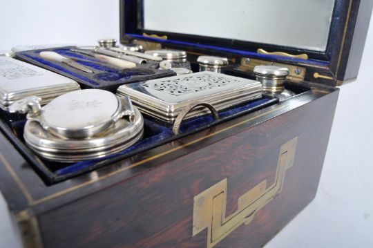 A William IV early 19th century circa 1830s rosewood & brass bound travelling dressing table & jewellery box. The box having brass inlays on each side with inlaid brass initials & crown to top. The case opening to reveal a fully appointed two tiered cobalt velvet interior with silver hallmarked & glass beauty pots, bottles & jars. Marked Archibald Douglas 1832, London. The box comprising of mother of pearl handle nail tools together with a penknife marked 'Asprey 166 Bond St'. The box measuring approx. 16cm x 34cm x 24cm.