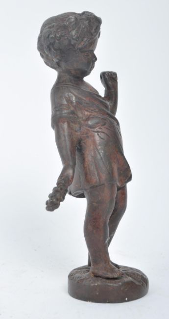 A 19th century bronze figure of child Bacchus / Dionysus, depicted with grapes in one hand & the other raised. Standing on decorated circular base. Measures approximately 21cm tall.