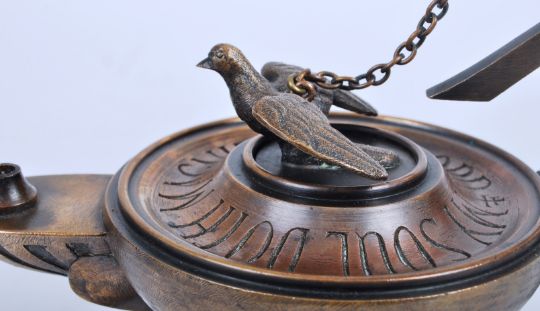 An early 20th century brass & bronze TOC H Christian movement 'Lamp of Maintenance'. The lamp having a Chi Rho symbol over a rem head handle chained to dove shaped lid. The lamp inscribed with 'My Soul Doth Magnify the Lord'. Raised on plinth wooden base. The lamp in original wooden case with leather latch. The lamp measuring approx. 22cm x 19cm x 10cm.