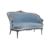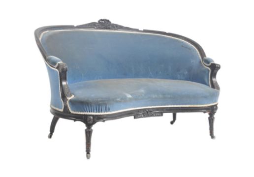A 19th century Victorian Aesthetic movement kidney shaped sofa. The sofa being raised on shaped legs with hoof feet. Above, a kidney shaped frame upholstered in blue damask fabric. The sofa with carved show wood detailed frame with shaped elbow rests. Measures approx. 103cm x 131cm x 77cm.