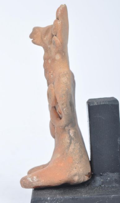 A Syro-Hittite 12th century BCE terracotta female fertility figure. The figure having a flat back, embellished headdress, folded arms on chest in seated  position. Measures approximately 9.5cm tall.