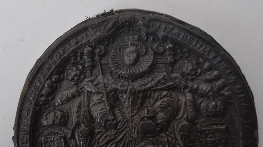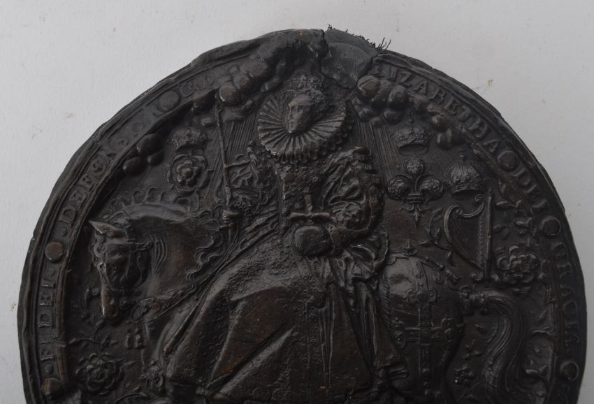 Elizabeth I Great Seal - brown wax tablet produced from the mould of the seal of Elizabeth I. Featuring Elizabeth I holding the orb and sceptre seated upon throne, to the verso the monarch is mounted riding a horse, with inlaid fleur de lis, Tudor rose and harp decoration. Thread remnants to the top and bottom from where the seal was attached to a document / indenture. Designed by miniature artist Nicholas Hilliard in 1586 to replace the first seal, this second seal was in use until the queen's death in 1603. Diameter approx. 15cm. Presented in a wooden frame with blue baize mount interior. Measures 27.5 x 27.5cm approx.
