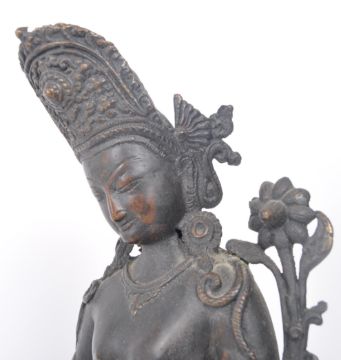 A 19th century circa 1850s Thai bronze sculpture depicting a standing goddess with embellished headdress & lotus blossoms around her arms. On plinth base. Measuring approx. 39cm tall.