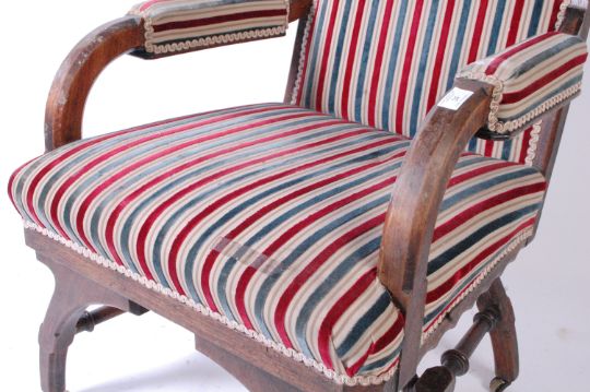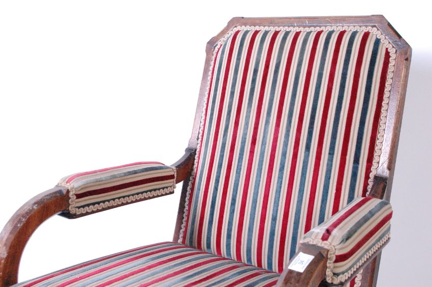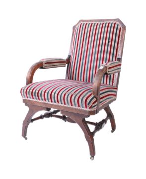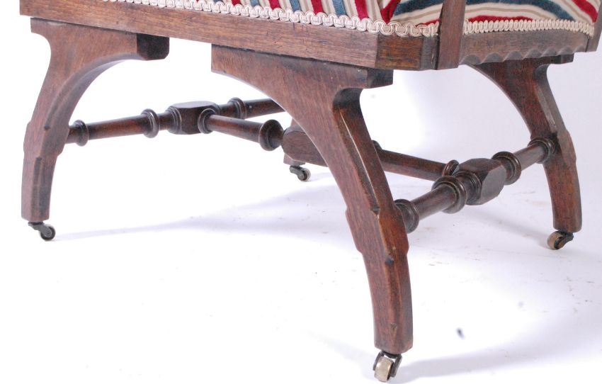 An Arts & Crafts late 19th century Arts & Crafts Movement oak framed library armchair. The armchair having a squared back over padded scrolled elbow rests. Raised on splayed arched supports with canted detailing united by an H shaped stretcher. Measures approx. 94cm x 60cm x 57cm.
