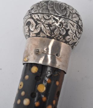 A High Victorian walking stick / cane with silver top, floral repousse decorated, on mahogany stick with spherical bone insert spots (some lacking, some replaced with bedazzle), wooden carved twist halfway. Hallmarks worn, maker's marks CM; 85cm tall.
