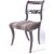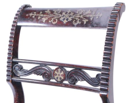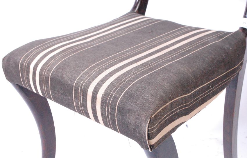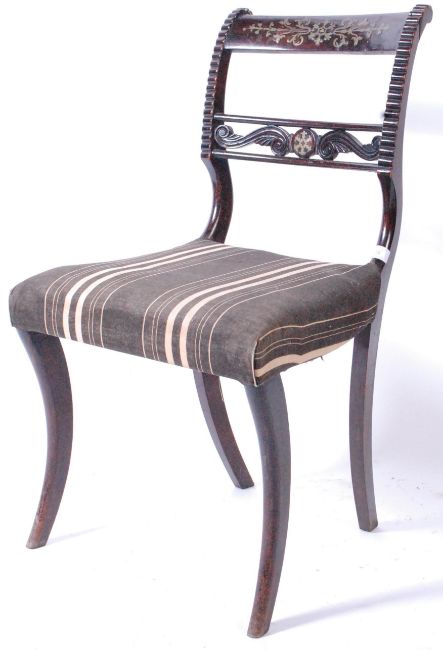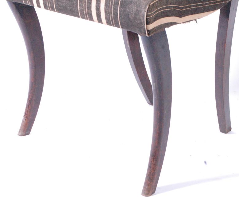 A set of four 19th century Regency mahogany and brass inlaid bar back dining chairs. Raised on sabre legs with overstuffed striped fabric upholstered seats beneath shaped and inverted back rests with pierced scroll gallery centres beneath brass inlaid top rails