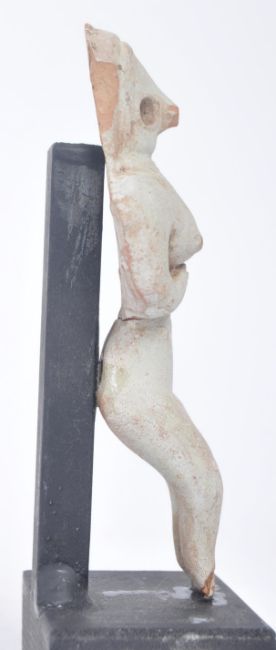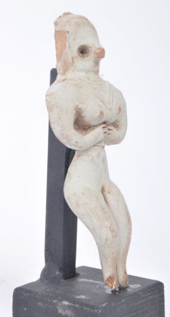 An Indus Valley fertility idol female figure, believed circa 3rd / 2nd Millennium BCE, modelled with hair style, necklaces, and hourglass figure with folded arms below chest. Measures approximately 11cm tall.