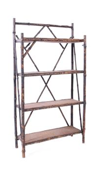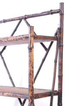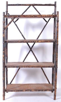 Victorian 19th century bamboo Aesthetic movement open bookcase - shelves.  Bamboo frame with open series of four shelves having cross over stretcher back and gallery to the top