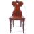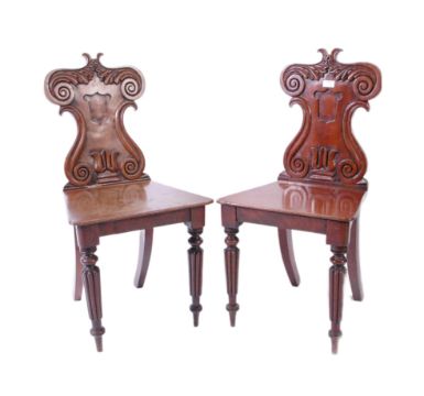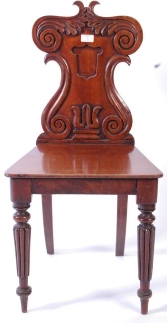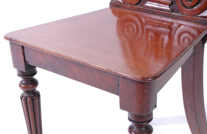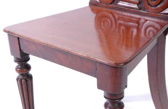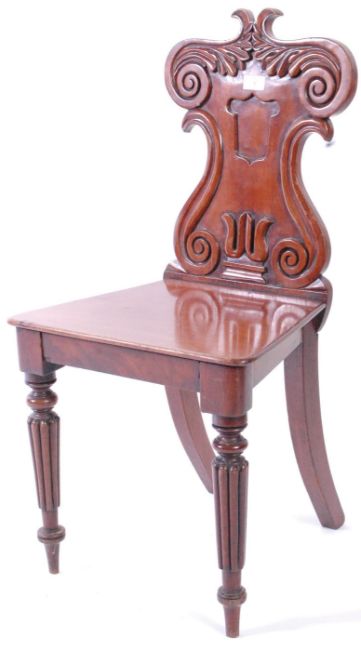 A pair of Victorian 19th century mahogany armorial hall chairs. Each raised on reeded and tapering legs with fitted panel wood seats beneath scrolled back rests with plain armorial cartouche centres