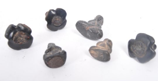 An assortment of six early 20th century & later stone hand carved Thai amulets pendants depicting Phra Pidta goddess with hands covering the eyes. To include examples with repeating depiction of the goddess, together with miniature charms.These amulets were and are to this day given to protect from danger, make the wearer invincible, and bring good luck. These amulets are produced in temples, then blessed by monks and sold to pilgrims.Largest amulet measuring approximately 3cm x 3cm x 2.5cm