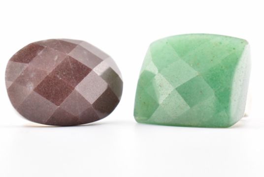 Two 925 silver & quartz set dress rings. The first having a faceted rectangular cut green aventurine quartz to squared shank together with a brown oval faceted cut stone with green flecks under a 10x loupe to squared shank. Total weight approx 36.8g. Approx sizes M & O.