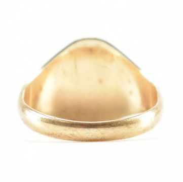 A hallmarked 9ct gold signet ring. The ring having an oval head with engraved detailing to the head. Hallmarked London 1967. Weight 5.2g. Approx size Q.5.