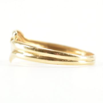 A yellow gold & diamond crossover ring. The ring having two bezel set round cut diamonds in a split head to wrap around crossover shoulders & band. Unmarked, surface tests indicate high carat gold. Total weight approx 1.8g. Approx size R.