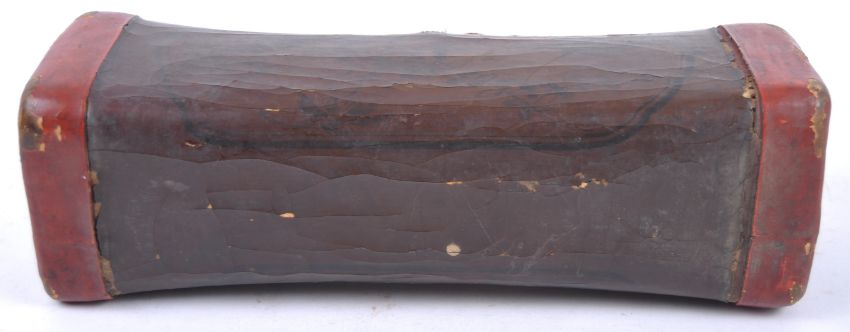 A 19th Century Chinese papier mache & lacquer head rest pillow. Shaped form with red lacquer edges, panel decorated sides and landscape decorated body. Measures approx; 37cm wide.
