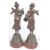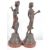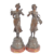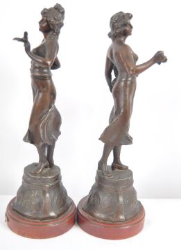 A pair of 19th Century French Art Nouveau spelter figures depicting classical ladies in full garments with one lady carrying a basket of fruit and the other a sash of roses. Each raised on embossed floral and shield bases upon circular wooden base. Each with a name plaque, one reading L'Hiveb and the other L'ete. Measures approx; 53cm tall.