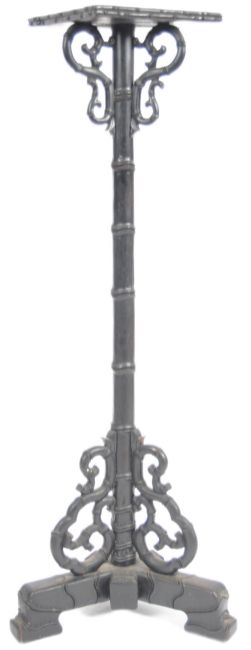 An early 20th Century Chinese / Chinoiserie jardinière planter stand having a square form top with central bamboo column raised on triform base with scrolled bamboo supports. Ebonised painted finish. Measures approx; 126cm tall.