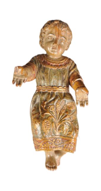 WITHDRAWN FROM SALE An 18th century Italian wood carved child Christ.  Polychrome painted, finely carved detailing of floral motifs on robes. Figure posed with arms outstretched and palms open. Believed to have be part of a larger piece. Approx. 35cm tall.
