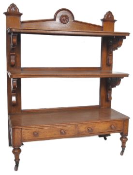 A 19th Century Victorian oak three tier buffet serving table. Central domed arched gallery back flanked by twin columns carved with leaves. Two shelves tiers supported by ornate scroll brackets raised above a twin drawer base set with turned handles raised on baluster turned legs with brown ceramic castors. Measures approx; 150cm x 120cm x 48cm.