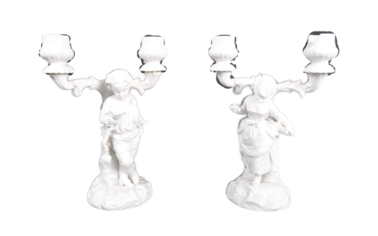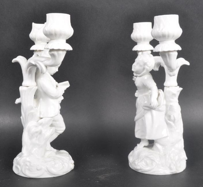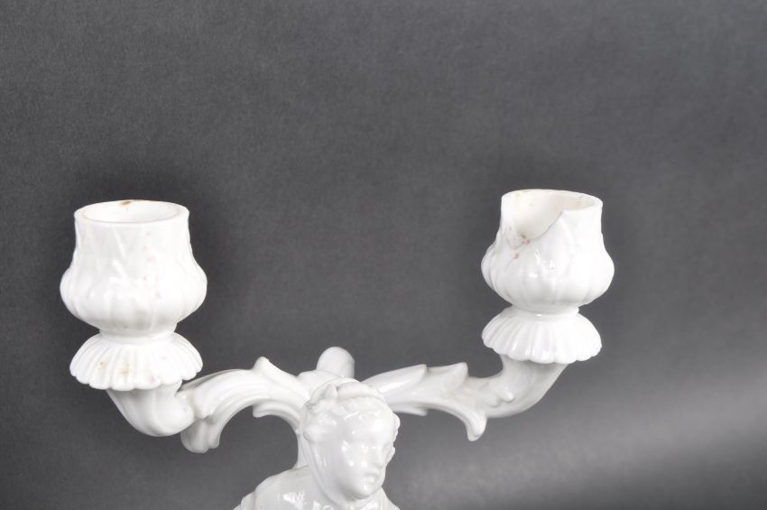 A pair of early 20th Century Parian ware blanc de chine porcelain figural candlesticks in the manner of Chelsea. Both depicting a young classical child with twin sconce candlestick raised on naturalistic domed base. Measures approx; 21cm tall.