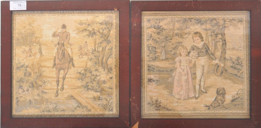 Two 19th Century framed and glazed tapestry panels with one depicting a hunt with figures on horse back. The other showing a young boy and girl walking their dog. Each set within a mahogany frame. Each measures approx; 30cm x 30cm.