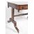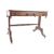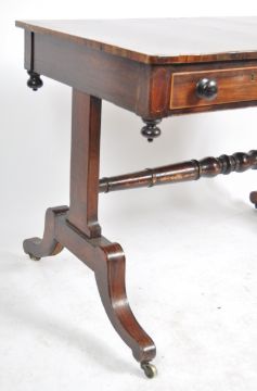 An early 19th Century Regency rosewood library table / writing table desk having a line inlaid top with turned ebonised handles to the twin drawer fronts all raised scroll trestle legs united by turned stretcher. Measures approx; 72cm x 101cm x 64cm.