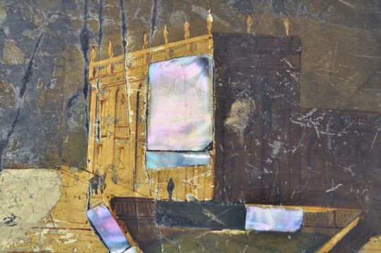 An early 19th Century Regency papier mache black lacquer tilt top wine table / occasional side table having a gilt serpentine edge tray top with painted scene inlaid with mother of pearl and abalone shell raised on an ebonised turned column over shaped tripod leg base. Measures approx; 70cm x 62cm x 49cm.
