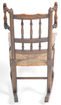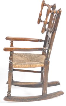 A 19th Century Lancashire / North Country oak childs rocking chair with spindle back and wings having a woven grass seat raised on block legs with spindle stretchers raised on bow rockers. Measures approx; 77cm x 40cm x 55cm.