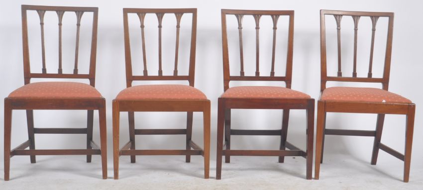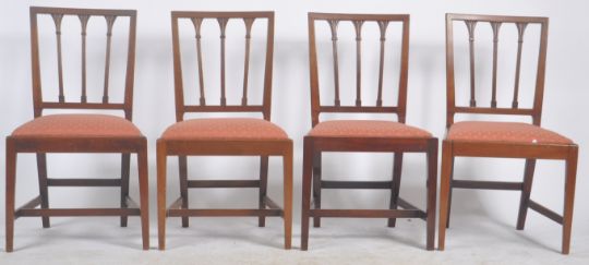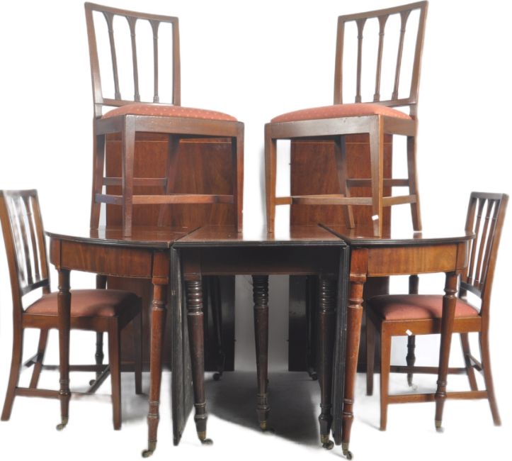 A large 19th Century Regency extending mahogany D end pedestal dining table and set of 8 chairs . Comprises two D ends with central table pedestal and two leaves. The chairs later with pierced backs and cushioned seats raised on tapered legs.