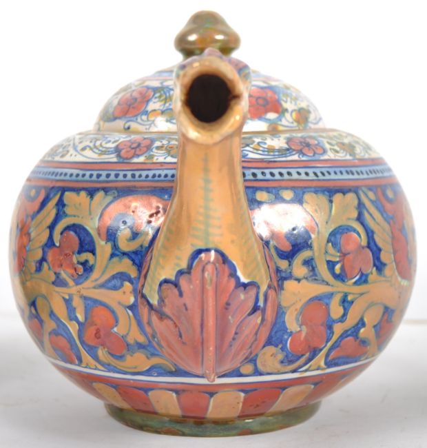 An early 20th Century Italian faience pottery three part tea service of large size. Hand painted decoration with glaze finish depicting flowers, cameos and mythical beasts. Made In Italy to undersides. Measures approx; 16cm.