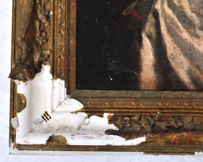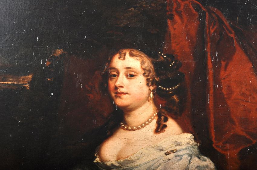 A 20th Century oleograph on canvas portrait painting depicting a lady seated in full garments with a draped red velvet curtain to the backdrop. Set within a decorative gilt scrolled frame with foliate detailing. Wear commensurate with age. Measures approx; 112cm x 80cm.