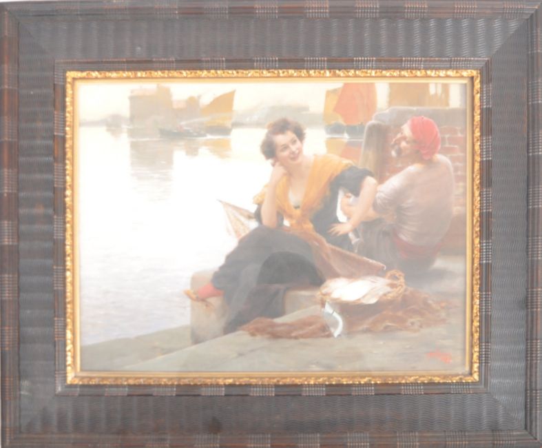 Alois Hans Schram (1864-1919) - An oil on board landscape / portrait painting scene depicting a young fair maiden seated on a shimmering dockside, joined by a gent with moustache and red hat, to the distance a port building with ships sailing. Set to a glazed ripple moulded frame. Measures approx; 62cm x 80cm.