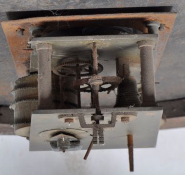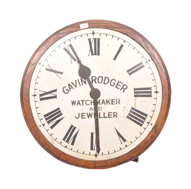 A large early 20th Century shop size advertising point of sale wall clock for Gavin Rodgers Watchmaker & Jeweller. The enamel dial being signed with Roman Numeral chapter ring and faceted hands set within a mahogany case. Exposed large fusee movement to verso. Measures approx; 71cm wide.