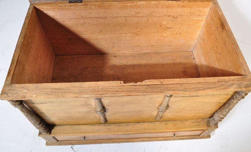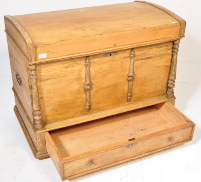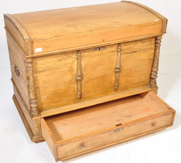 A 19th Century pine blanket box chest steamer trunk. Domed top with carved columns to the front. The hinged lid opening to reveal a spacious interior. Measures approx 81cm x 181cm x 78cm.
