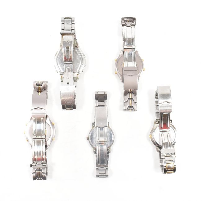 A group of five watches. The lot to include Philip Persio titanium quartz watches, a Casio wave receptor, Sekonda S and a Solar 2000. Largest faces 45mm, smallest 37mm.