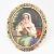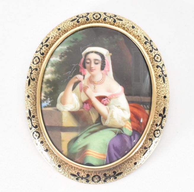 An antique gold & enamel 'La Marguerite' portrait brooch pin. The brooch having an oval portrait depicting a pensive woman plucking petals from a flower in colourful clothing & beaded jewellery to a yellow gold & black enamel scrolling mount. C clasp to verso & blue enamel marked ' La Marguerite '. Unmarked, tests indicate high carat gold. Total weight approx 17.3g. Measures approx 5.7x4.8cm. In tooled leatherette shield shaped Delarue 39 Palais Royal box.